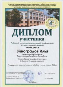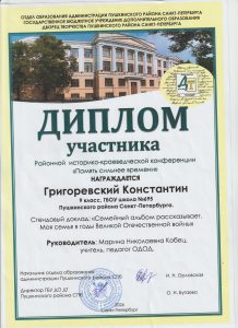 Григоревский Константин представил стендовый доклад на тему: «Семейный альбом рассказывает. Моя семья в годы Великой Отечественной войны». Виноградов Илья представил авторскую экскурсию-фильм «Орлов Тимофей Никитович-защитник Пулковских высот».